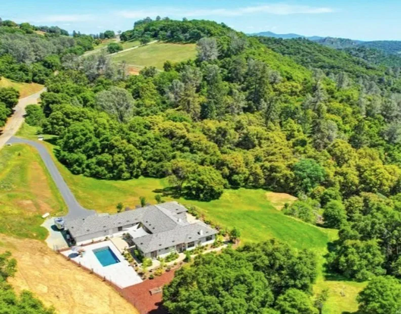 French doors opening to the pool with outdoor dining or front patio with valley views